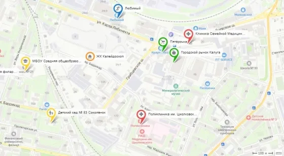 Дом выгодно расположен в центральной части города Калуги, в шаговой доступности школы, детские сады, спортивные объекты, магазины, поликлиники и остановки общественного транспорта, другая городская инфраструктура.