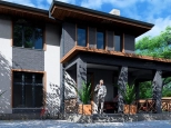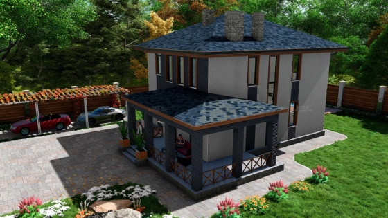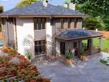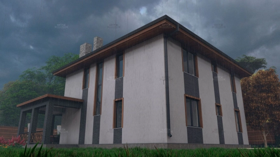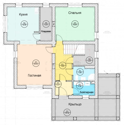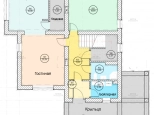 Первый этаж: Большая терраса, через которую вход в дом. Просторная кухня-гостиная со своей кладовой. Гостевая спальня или кабинет. Санузел. Бойлерная.
