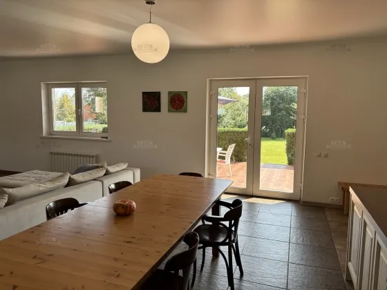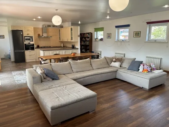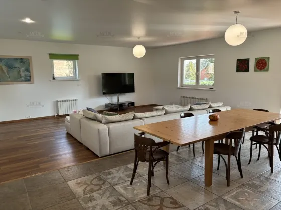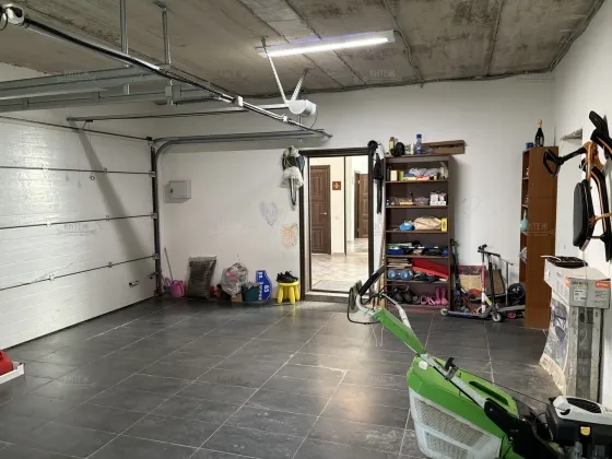 На 1 этаже кухня-гостиная с выходом на террасу, прихожая, туалет, отапливаемый гараж на две машины с автоматическими воротами-рольставнями, котельная.