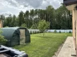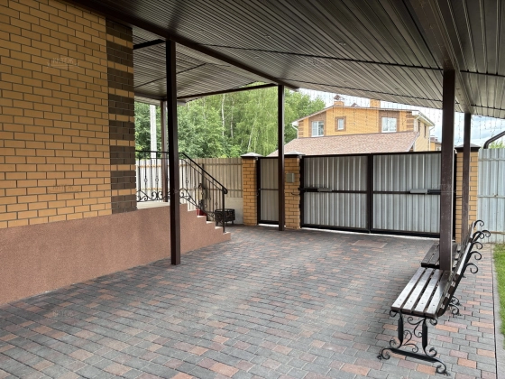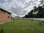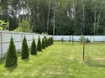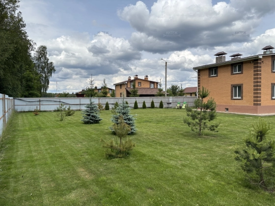 Участок 13,8 соток со всех сторон огорожен забором, при въезде распашные ворота с электроприводом. Перед входом в дом и перед гаражом территория выложена плиткой, сделан капитальный навес с точечным освещением. В остальном на площади участка ровный и мягкий ковёр зелёного газона. На участке ели, туи, парник, грядки, детский спортивный уголок, летний душ, мангальная зона.