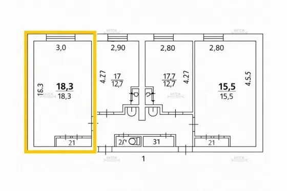 Проcторная комнатa 18,3 м² в блокe на 4 комнаты.