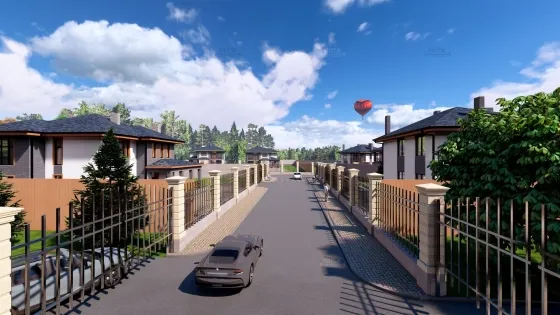 Закрытая территория со входной группой. Асфальтированные дороги. Освещенные улицы. Коммуникации под землей (электричество, газ, центральное водоснабжение).