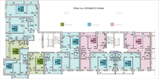 2 корпуса. 9 этажей. Площадь квартир от 42 до 111,4 кв.м.